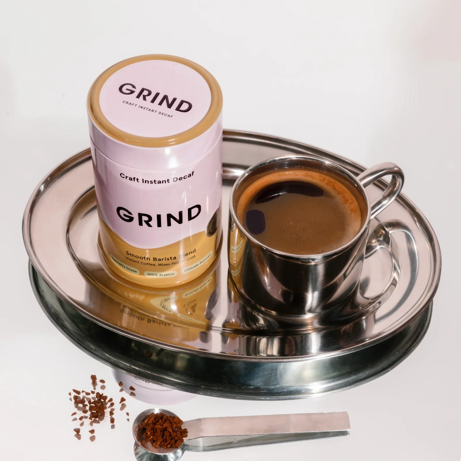 A 90g tin of speciality-grade decaf instant coffee, ready to mix with hot or cold water.